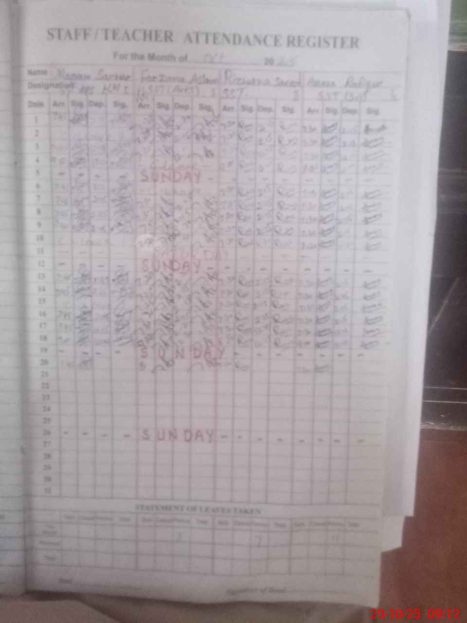 | Remarks (Use Separate Page if Required): Maryum Aslam transferred to this school as Headmistress but her ops Headmistress orders suspended by honorable Lahore High Court vide Momo No 5567 A II dated 14 October 2025 letter issued by DEO SE Lahore | |||||