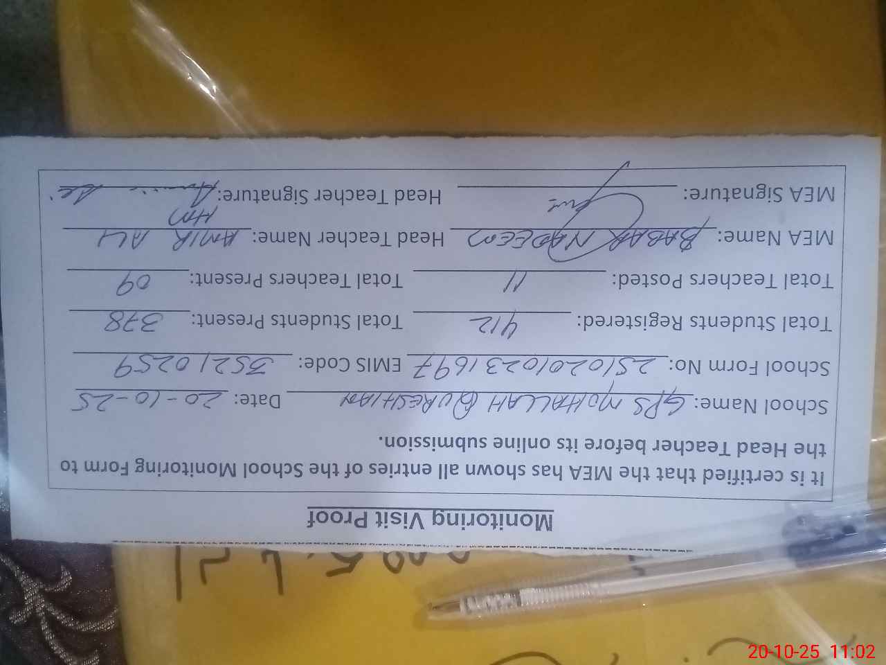 | Attendance Register | Head Teacher | MEA with School | Visit Proof |