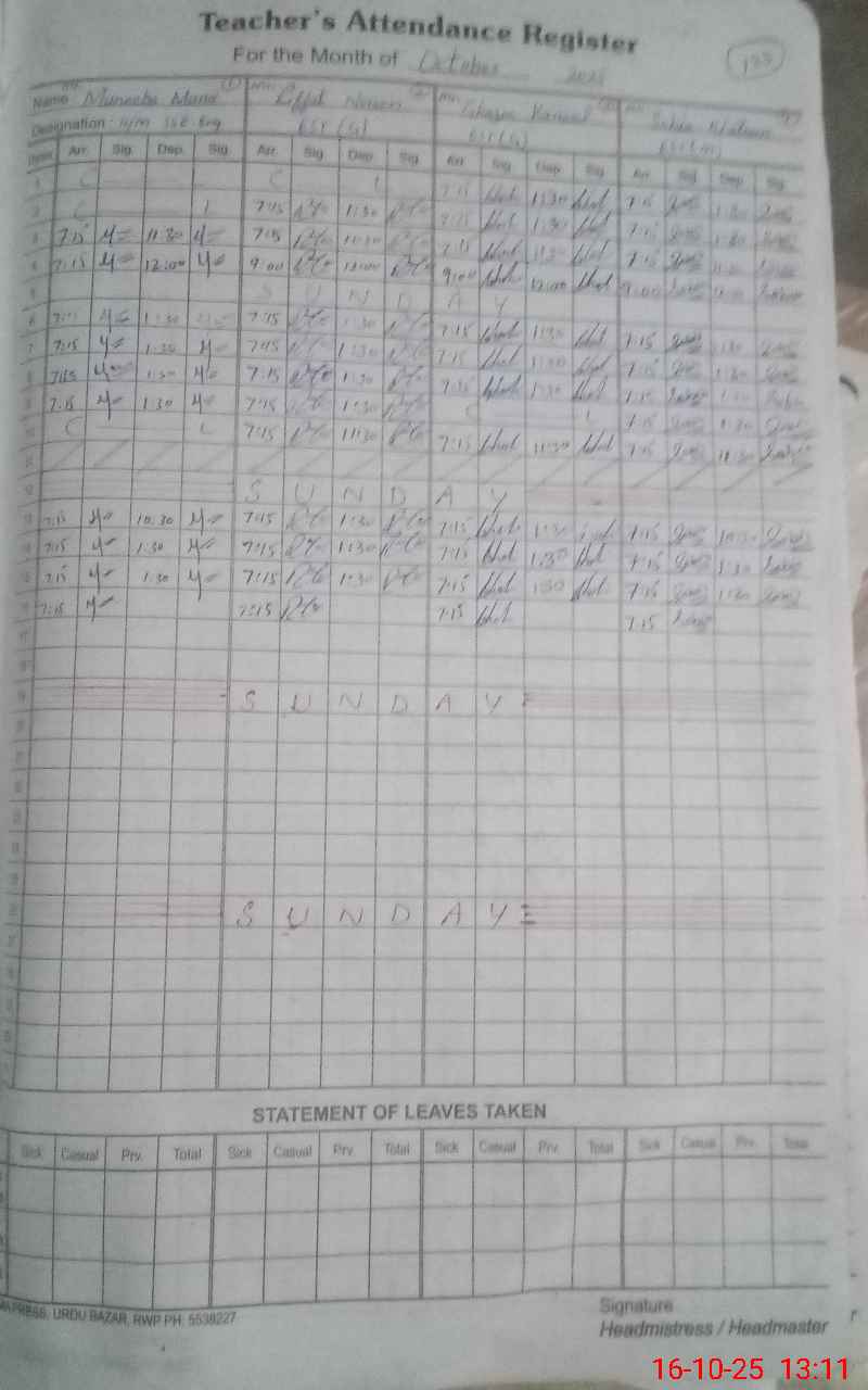 | CNIC | Full Name | Designation | R/C | Absence During Last Calender Month |