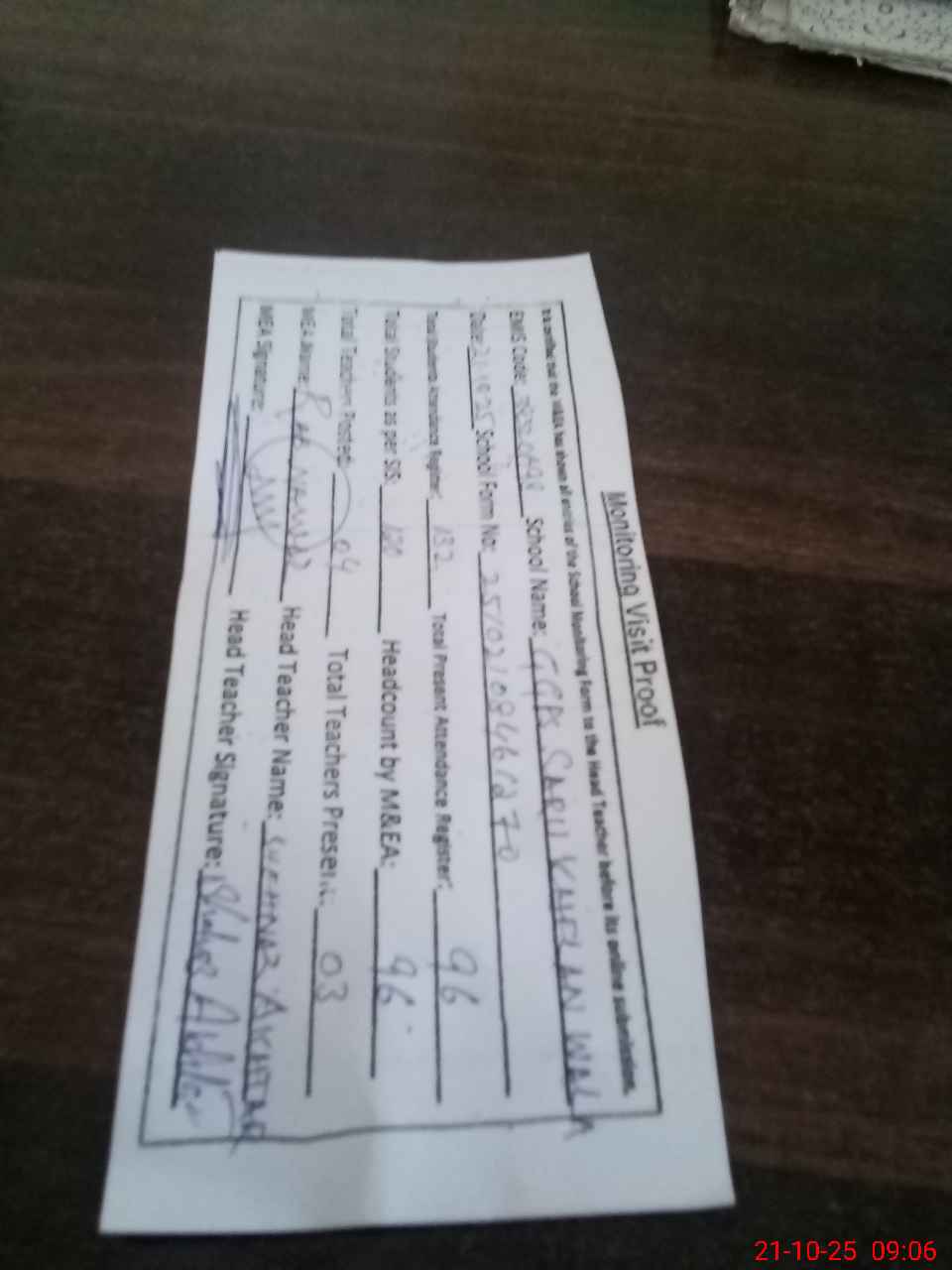 | Attendance Register | Head Teacher | MEA with School | Visit Proof |