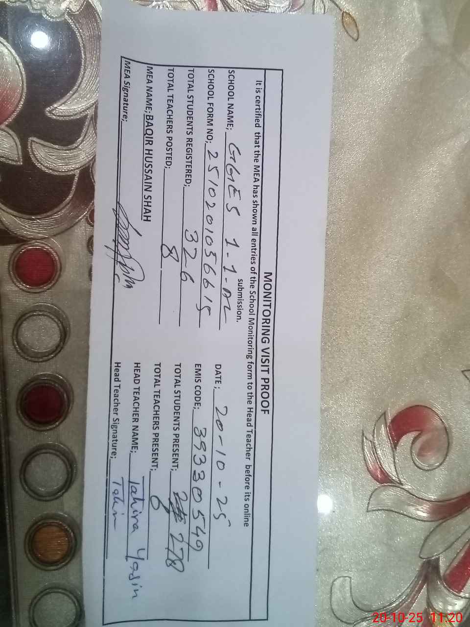 | Attendance Register | Head Teacher | MEA with School | Visit Proof |