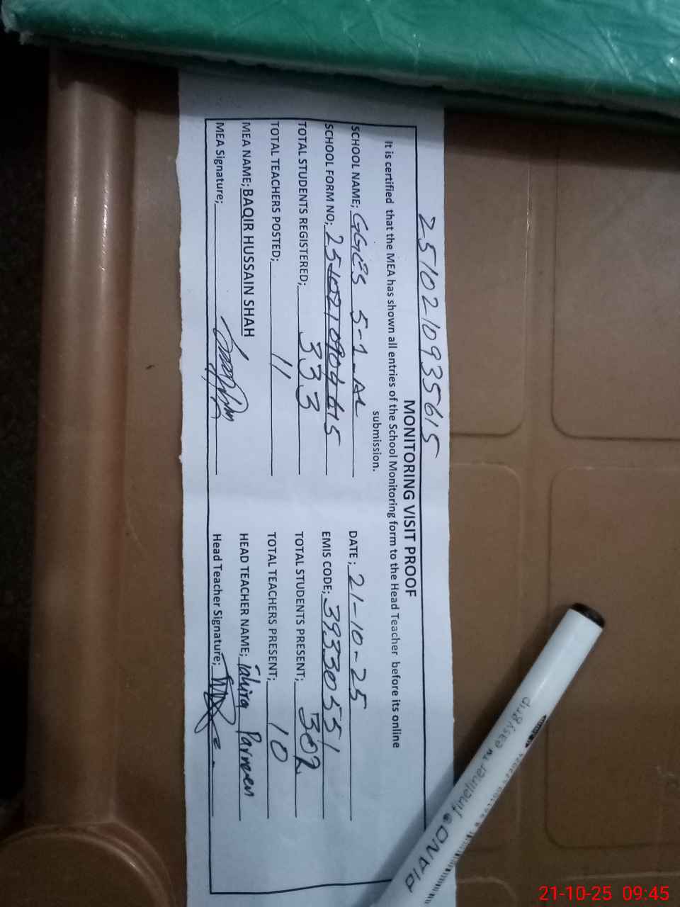 | Attendance Register | Head Teacher | MEA with School | Visit Proof |