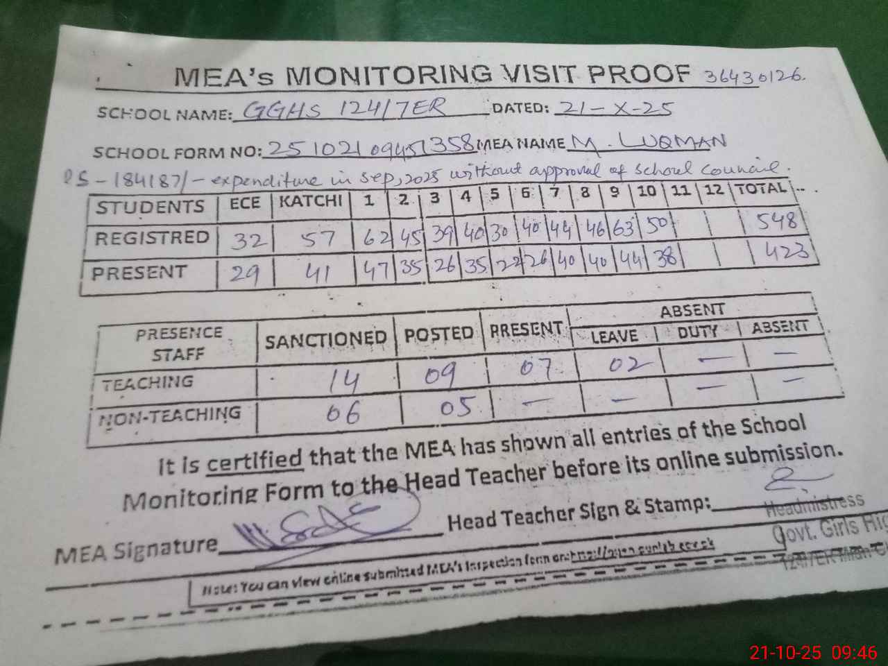 | Attendance Register | Head Teacher | MEA with School | Visit Proof |