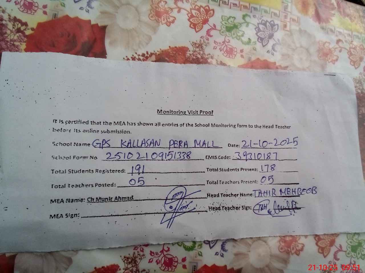 | Certified that this School was Inspected by the Undersigned MEA/DMO Today and the Information Stated Above is as Per Record. | |||||