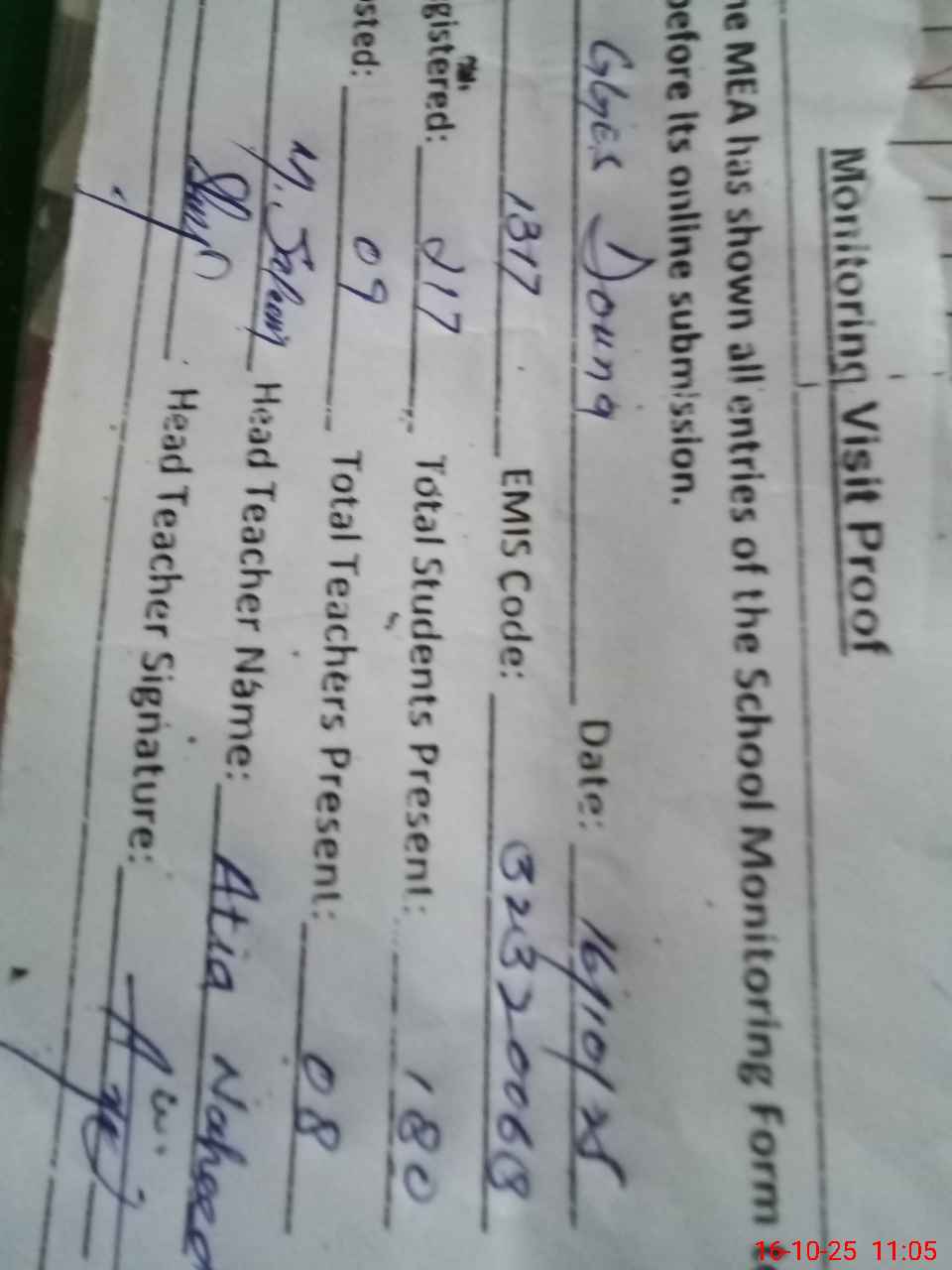 | Attendance Register | Head Teacher | MEA with School | Visit Proof |