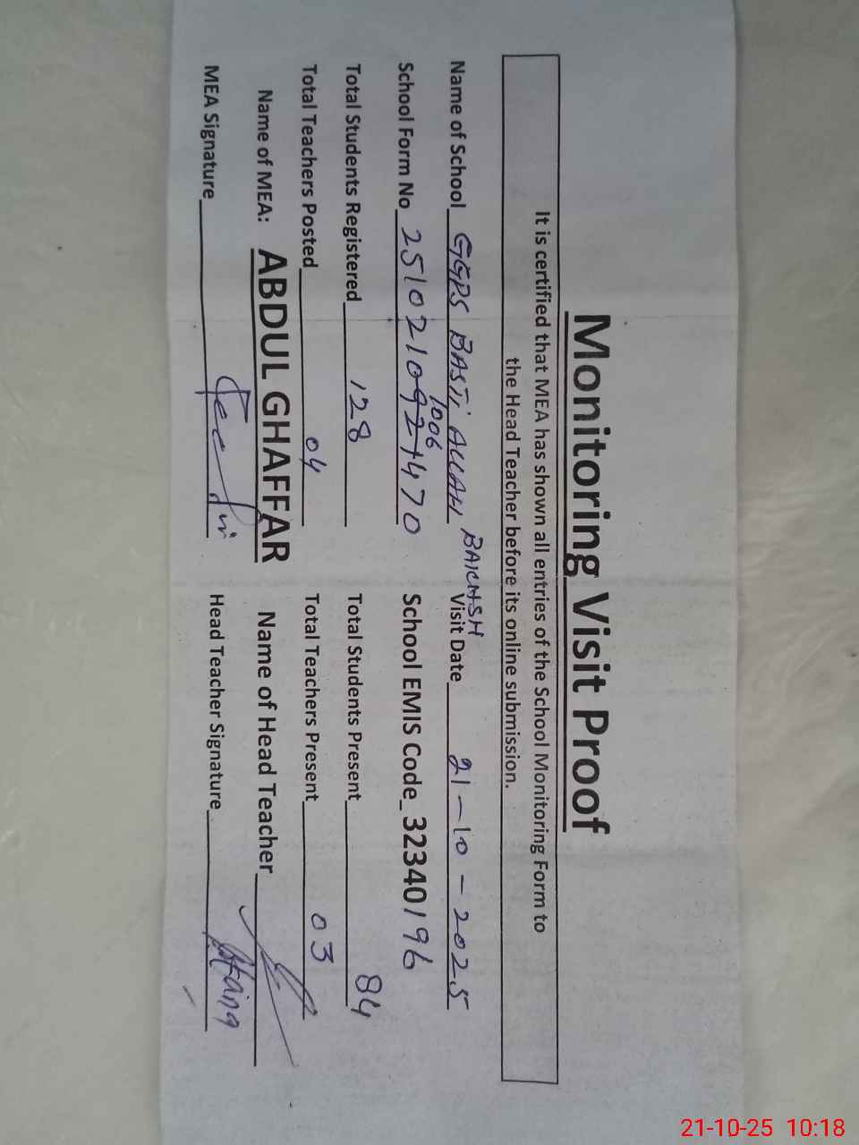 | Remarks (Use Separate Page if Required): Aftab Ahmed peon is a temporary adjustment in school present Allredy school visit Don but location is a problem | |||||