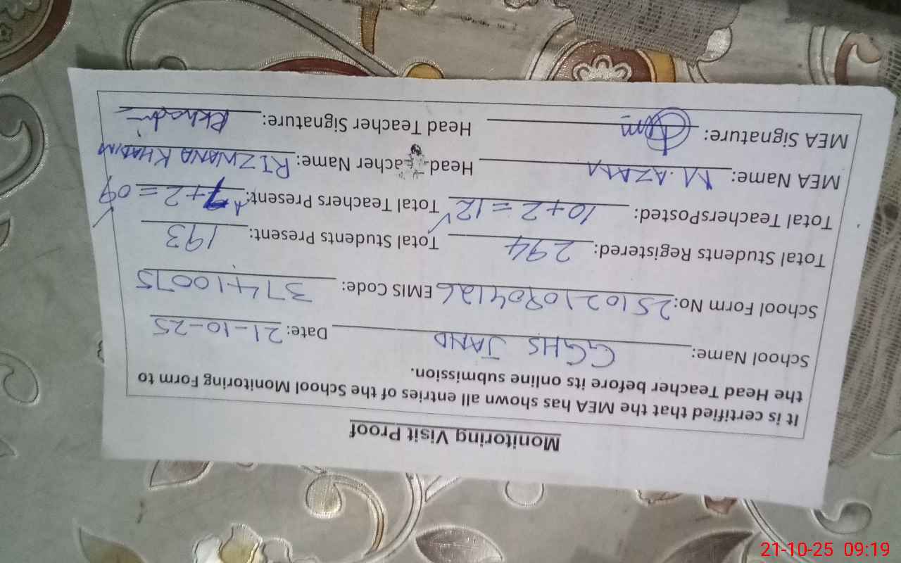 | Certified that this School was Inspected by the Undersigned MEA/DMO Today and the Information Stated Above is as Per Record. | |||||