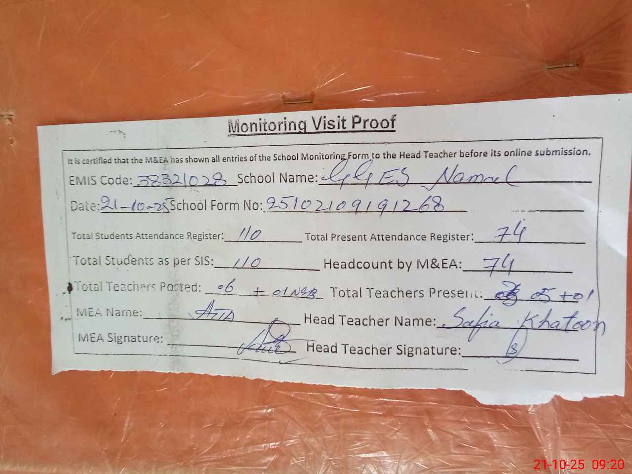 | EMIS Code: 38321028 | Name of School: GGES NAMAL CHAKRALA MIANWALI | |||