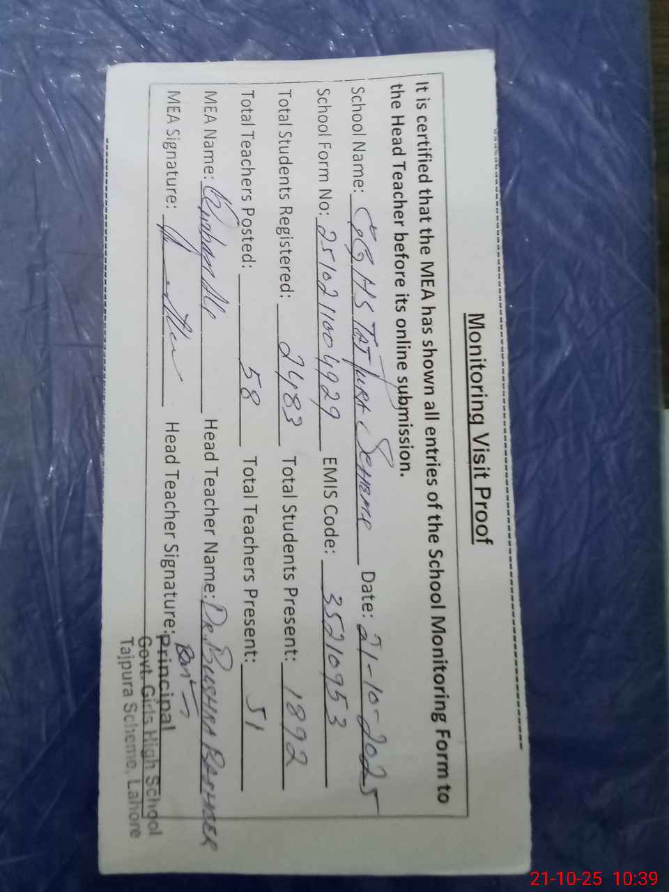 | EMIS Code: 35210953 | Name of School: GGHS TAJ PURA SCHEME TEHSIL SHALIMAR | |||