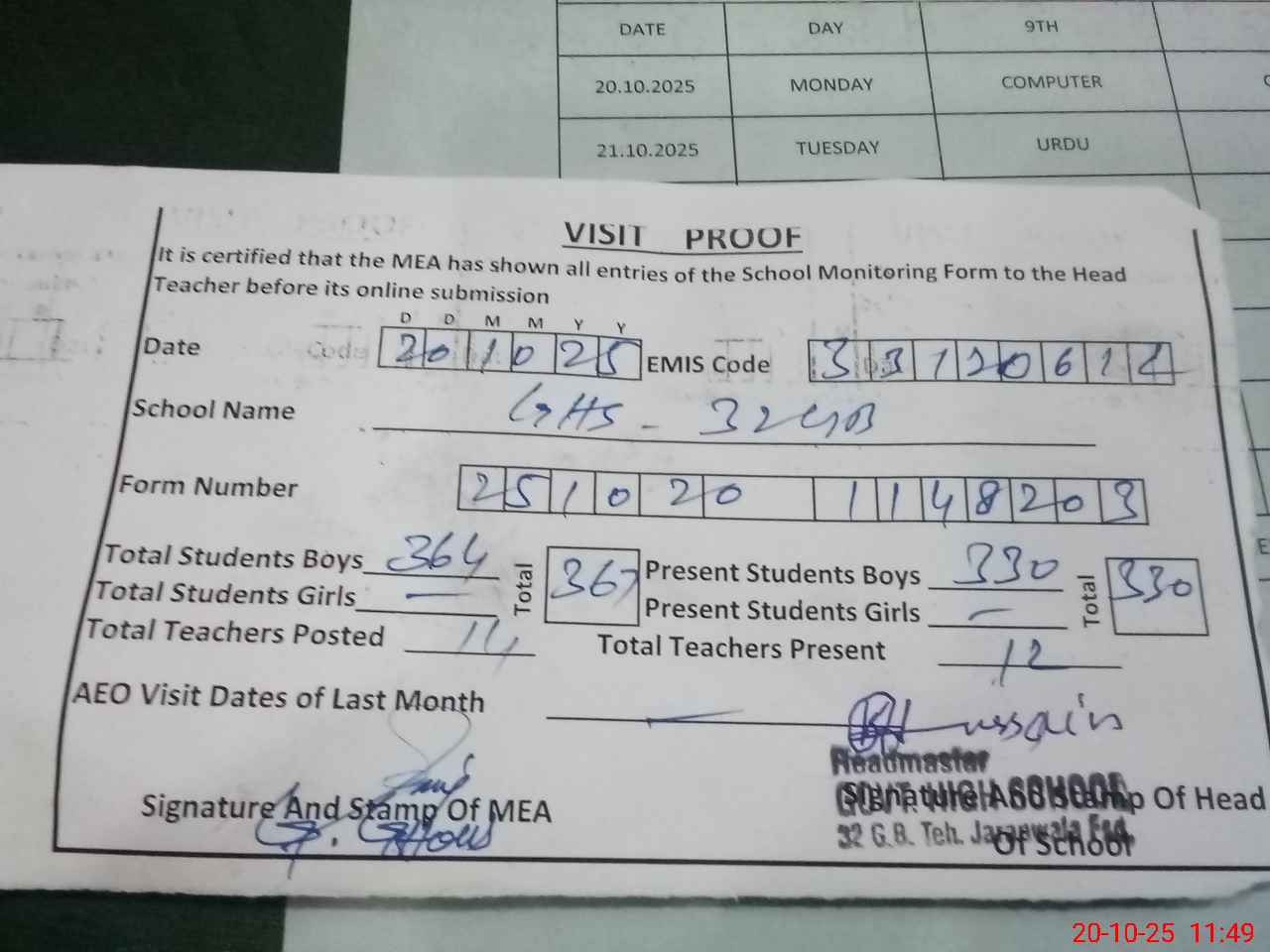 | EMIS Code: 33120612 | Name of School: GHS CHAK 32 GB | |||