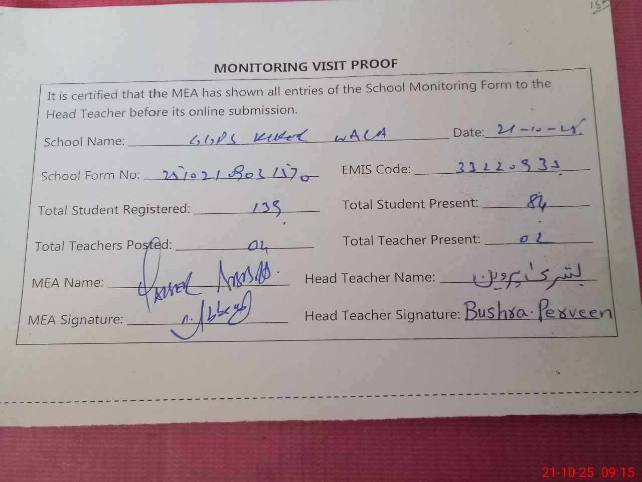 | Attendance Register | Head Teacher | MEA with School | Visit Proof |