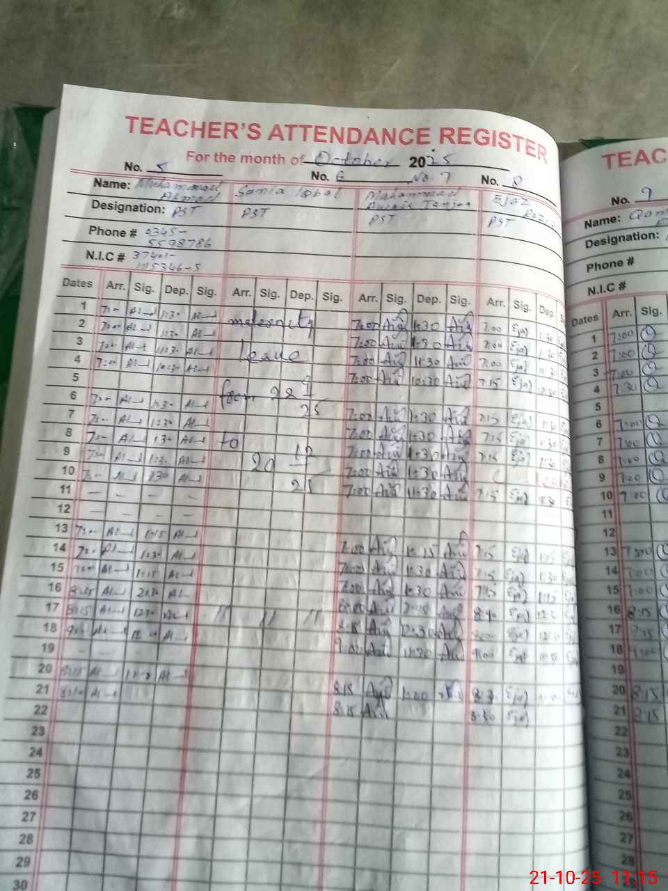 | CNIC | Full Name | Designation | R/C | Absence during last cal. month |