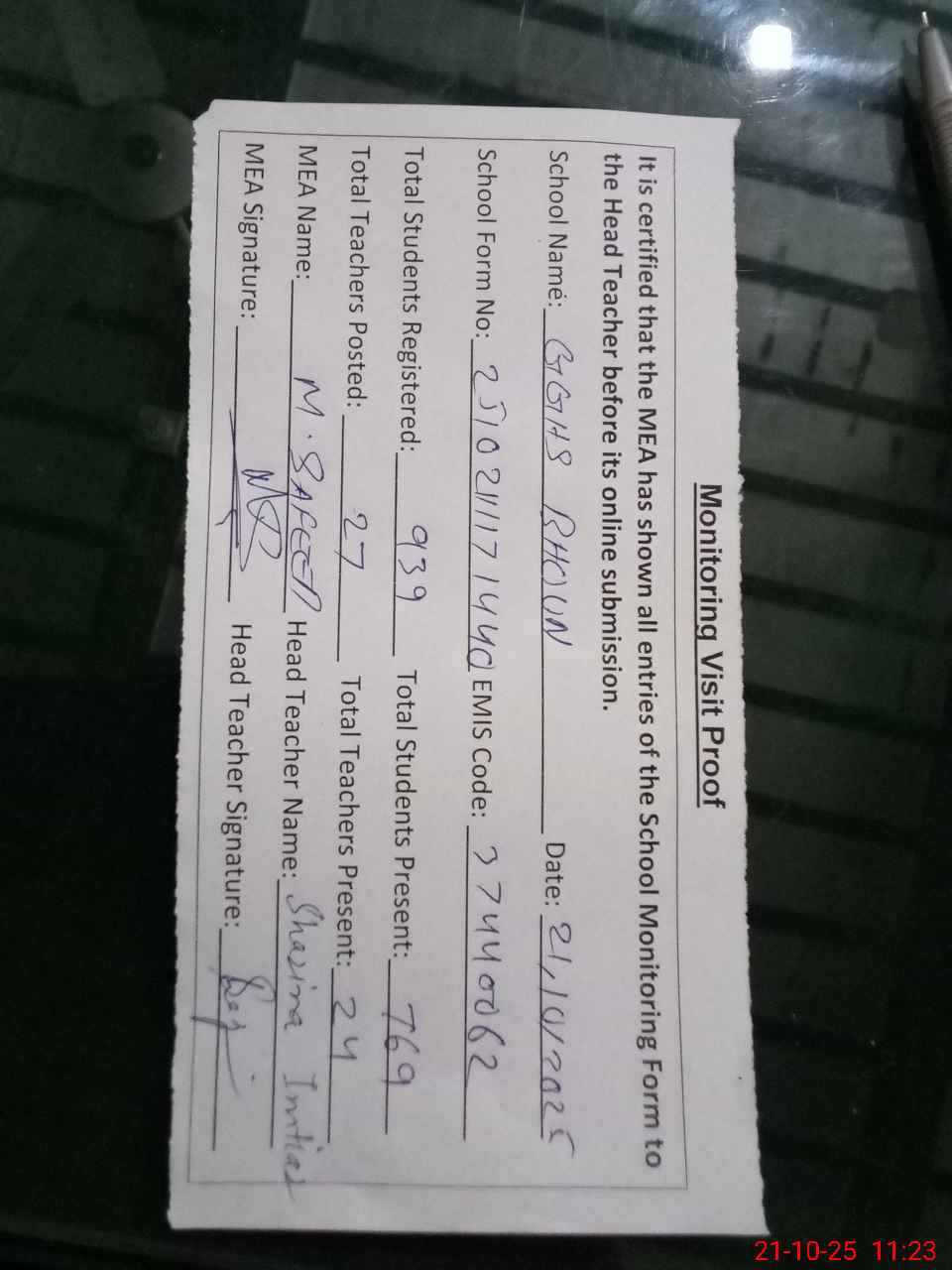 | Attendance Register | Head Teacher | MEA with School | Visit Proof |