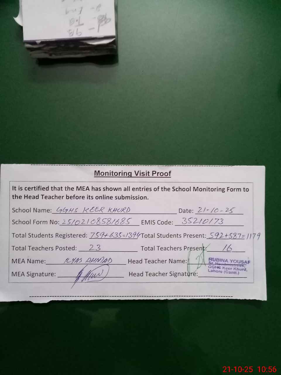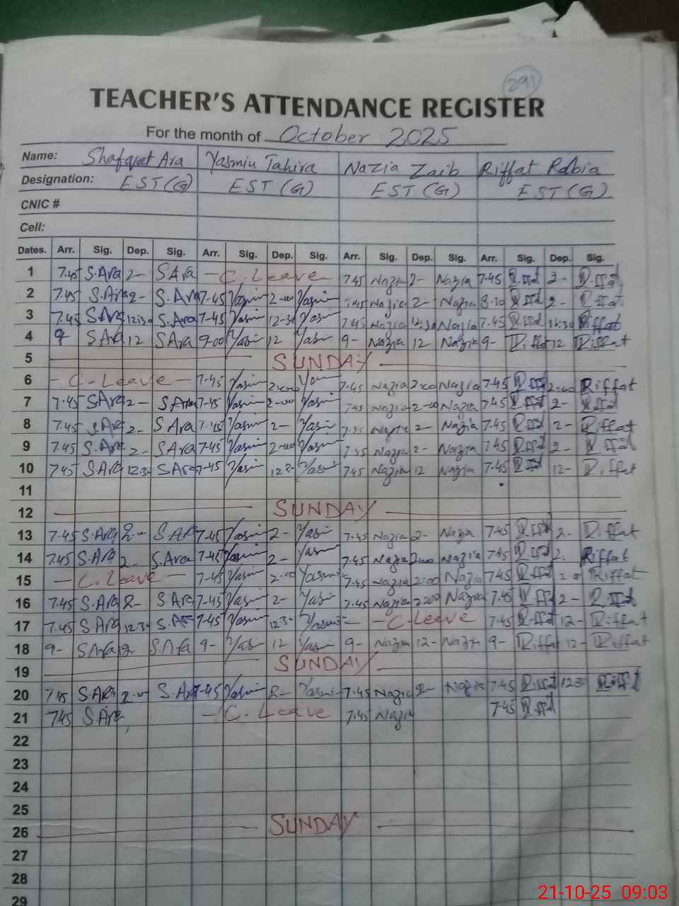 | Remarks (Use Separate Page if Required): Teacher Quratullain SSE medical leave wef 4 September 2025 for One month and 10 October 2025 for One month both have not been approved so far Soaps are missing at some hand washing points | |||||