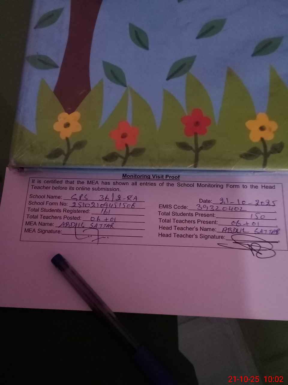 | Attendance Register | Head Teacher | MEA with School | Visit Proof |