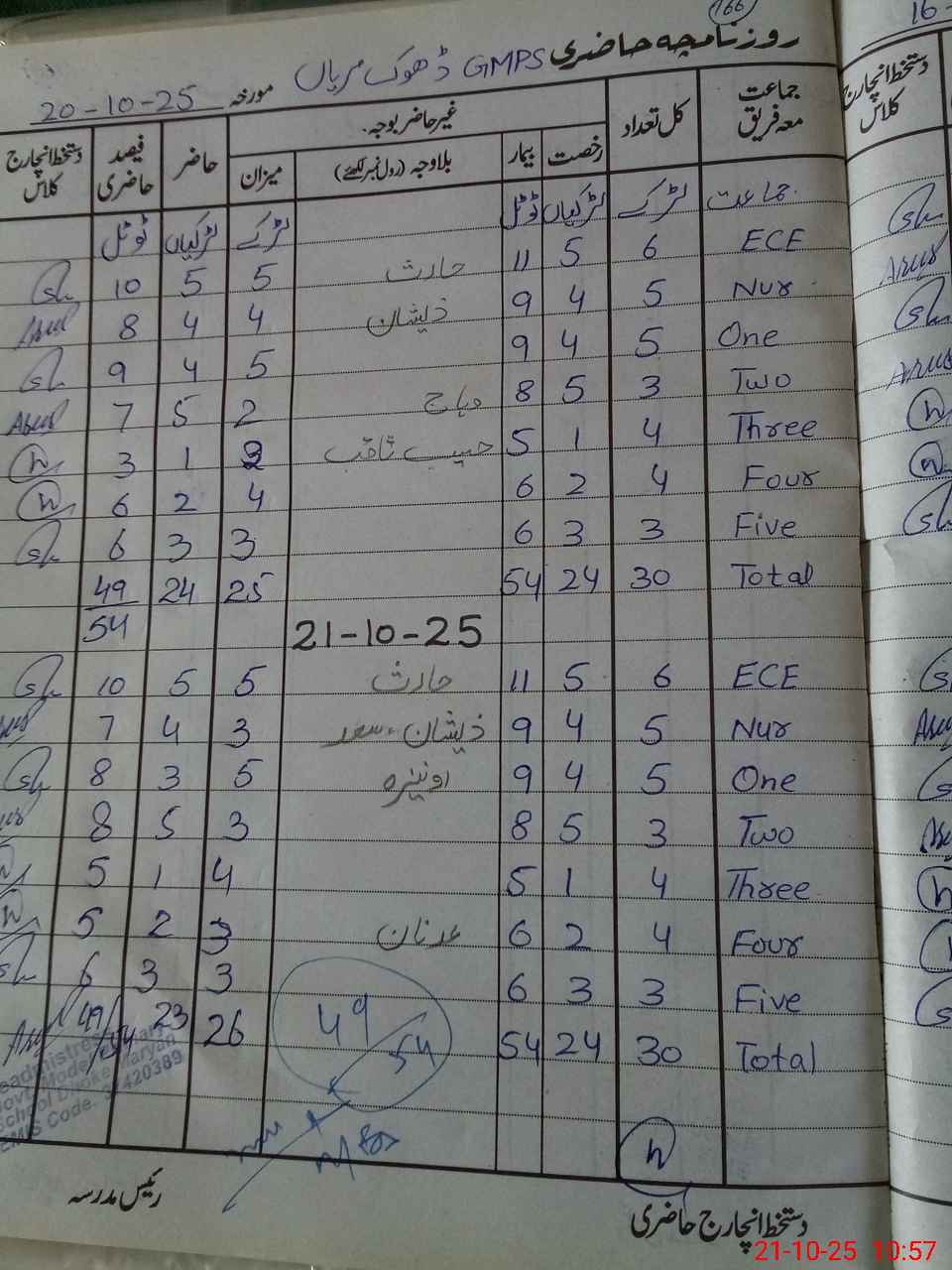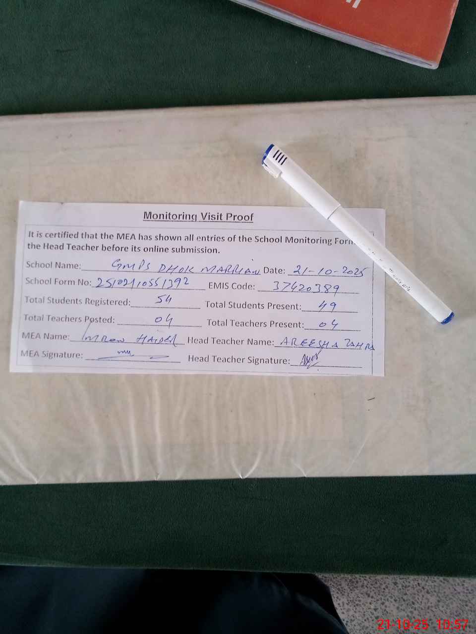 | Attendance Register | Head Teacher | MEA with School | Visit Proof |