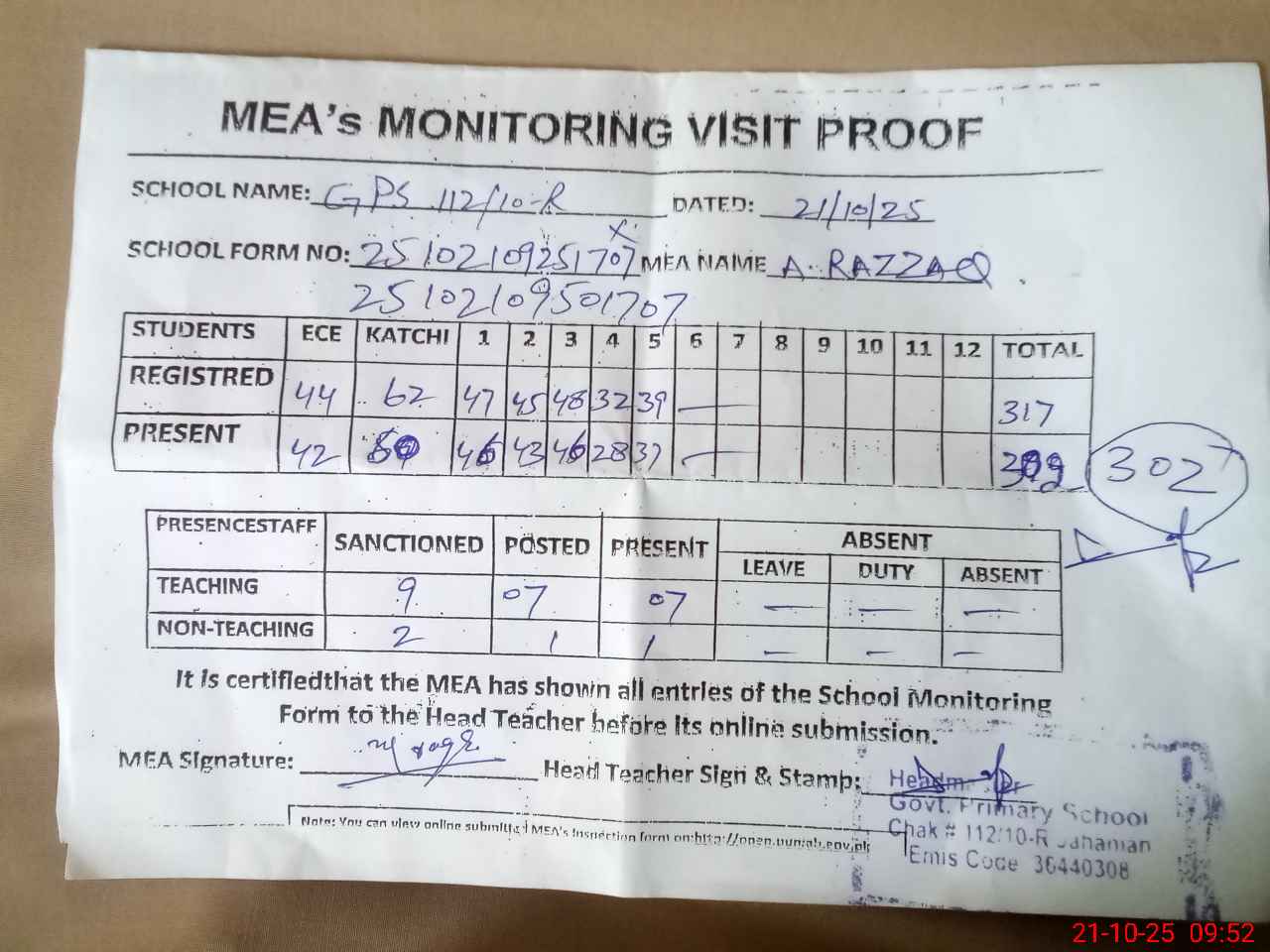 | EMIS Code: 36440308 | Name of School: GPS 112/10-R, JAHANIAN | |||