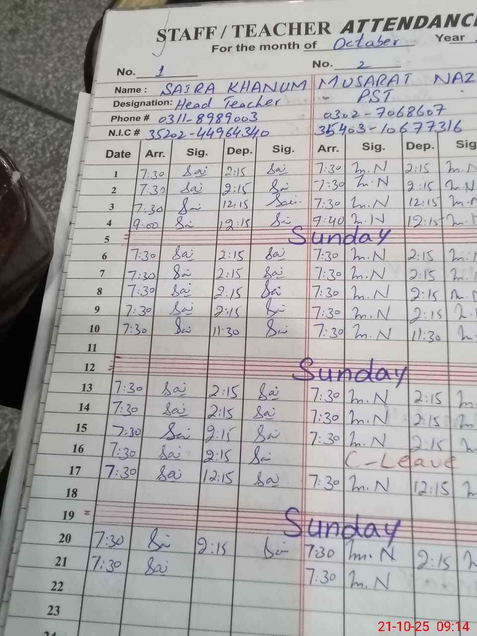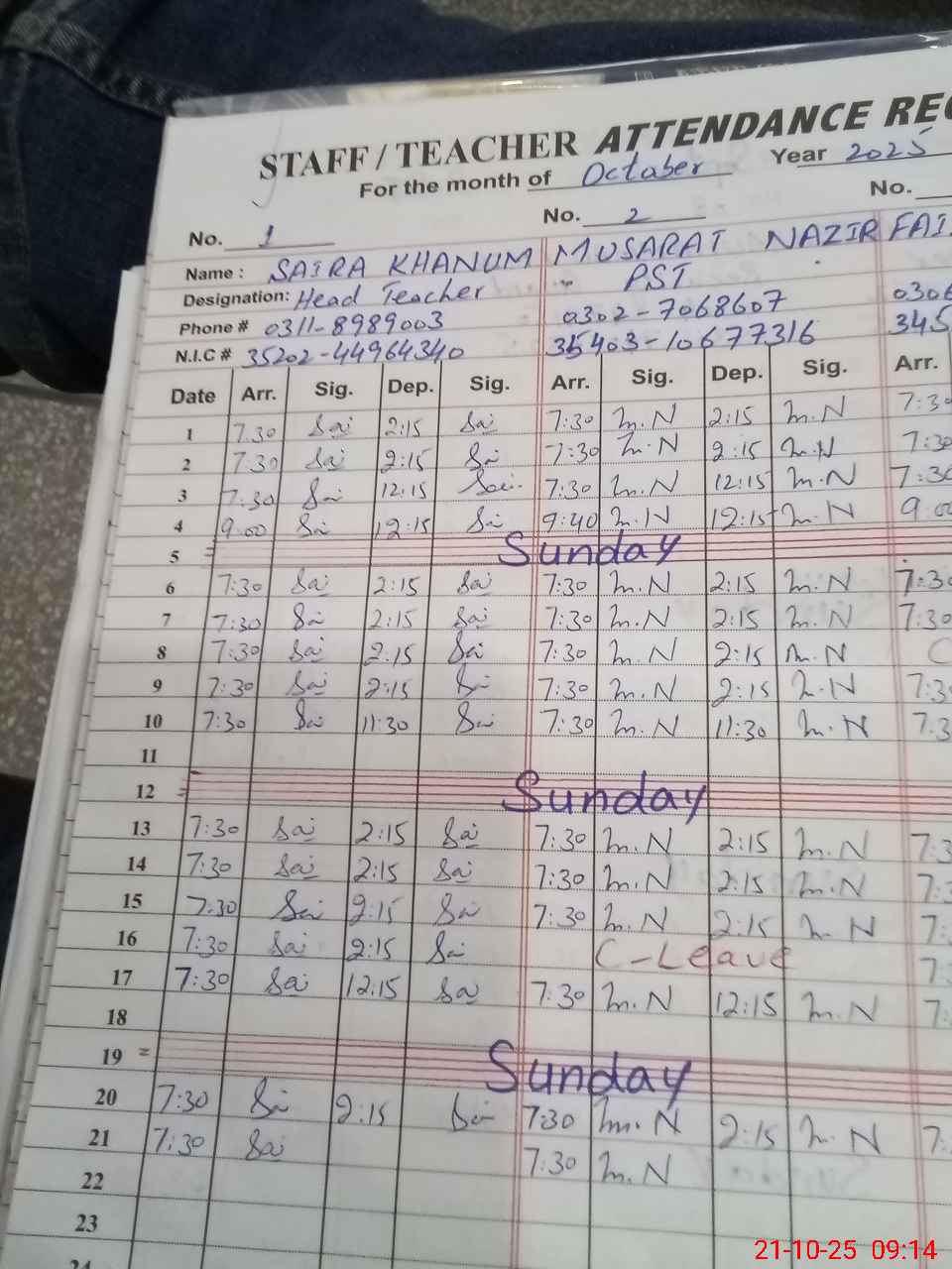 | CNIC | Full Name | Designation | R/C | Absence During Last Calender Month |