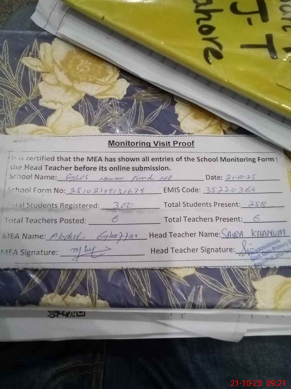 | Attendance Register | Head Teacher | MEA with School | Visit Proof |