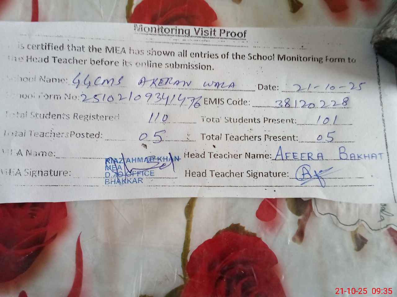 | Certified that this School was Inspected by the Undersigned MEA/DMO Today and the Information Stated Above is as Per Record. | |||||