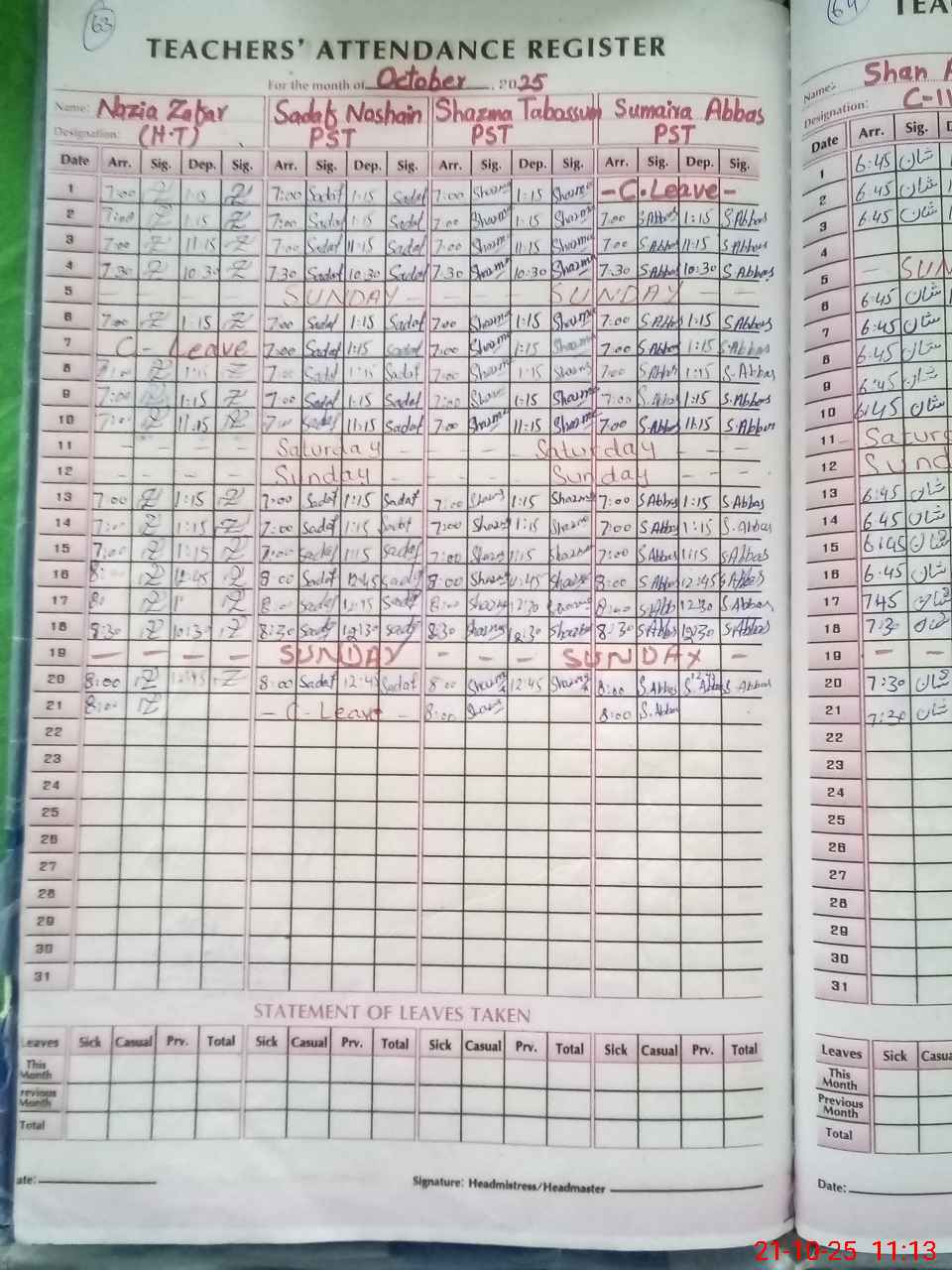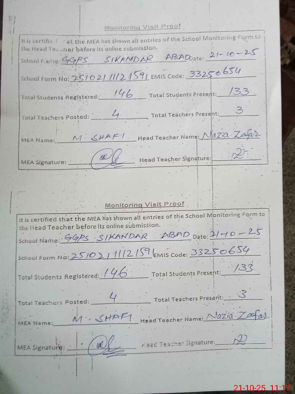 | Attendance Register | Head Teacher | MEA with School | Visit Proof |