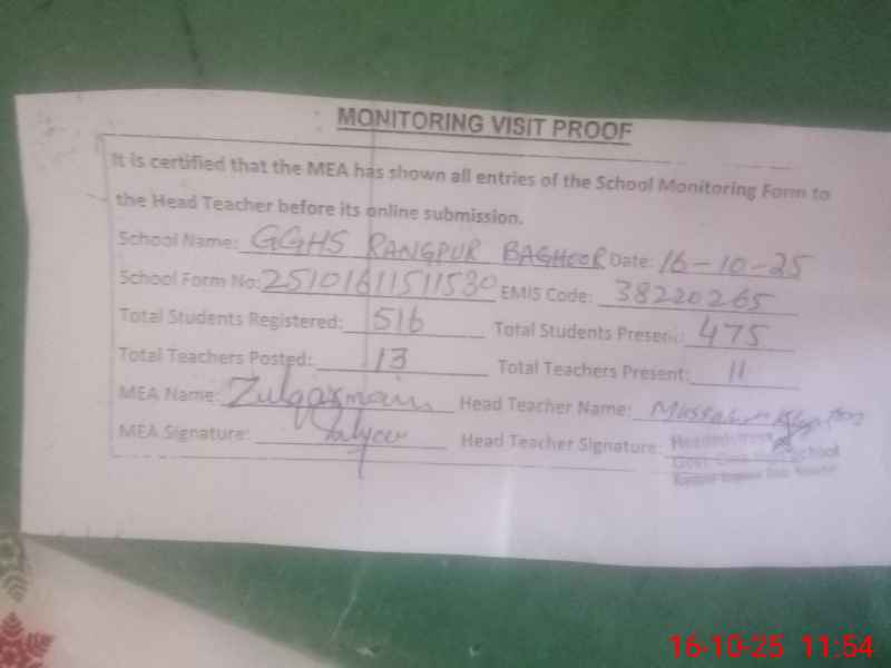 | EMIS Code: 38220265 | Name of School: GGHS RANG PUR BAGHOOR | |||