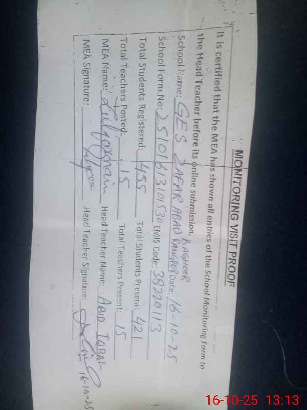 | EMIS Code: 38220113 | Name of School: GES ZAFAR ABAD RANG PUR BAGHOOR | |||