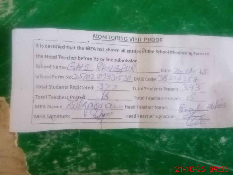 | EMIS Code: 38220258 | Name of School: GHS RANGPUR BAGHOOR | |||