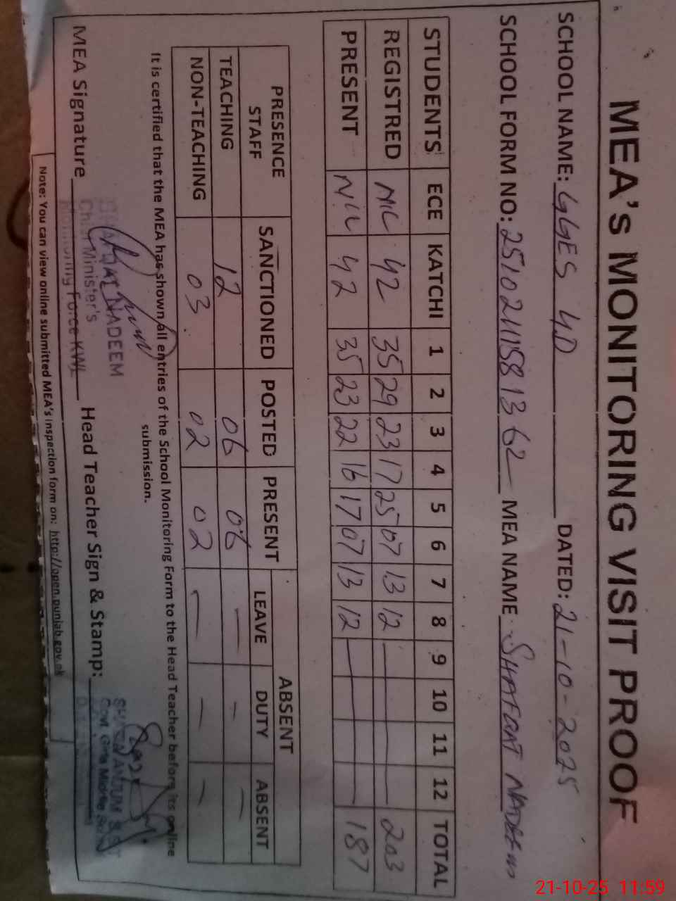| Attendance Register | Head Teacher | MEA with School | Visit Proof |