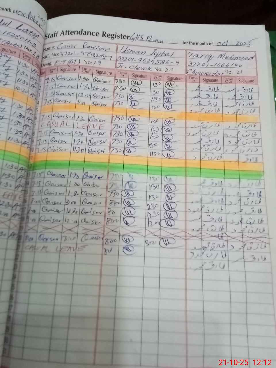 | CNIC | Full Name | Designation | R/C | Absence during last cal. month |