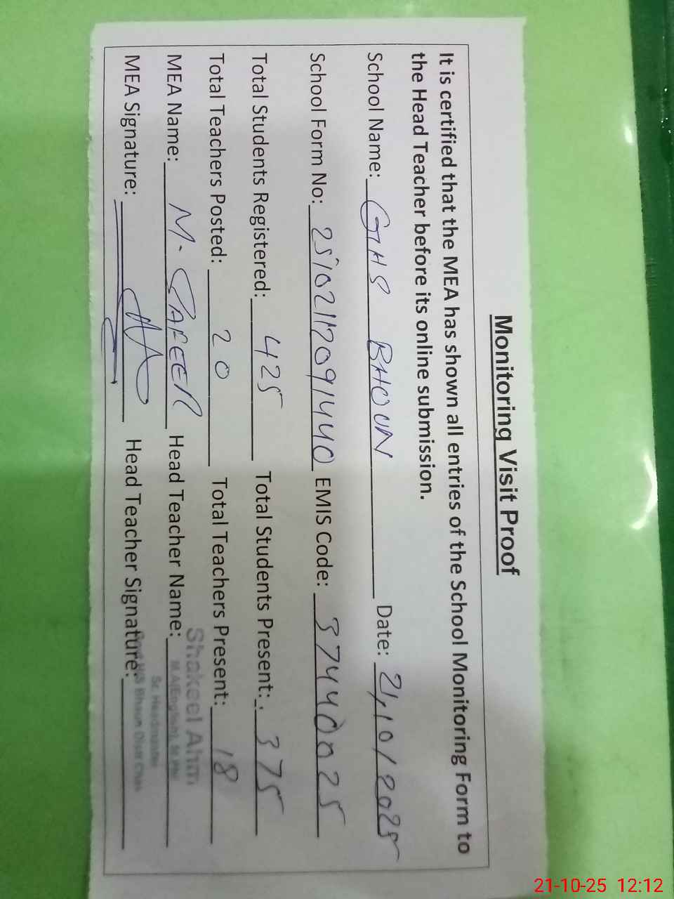 | Attendance Register | Head Teacher | MEA with School | Visit Proof |