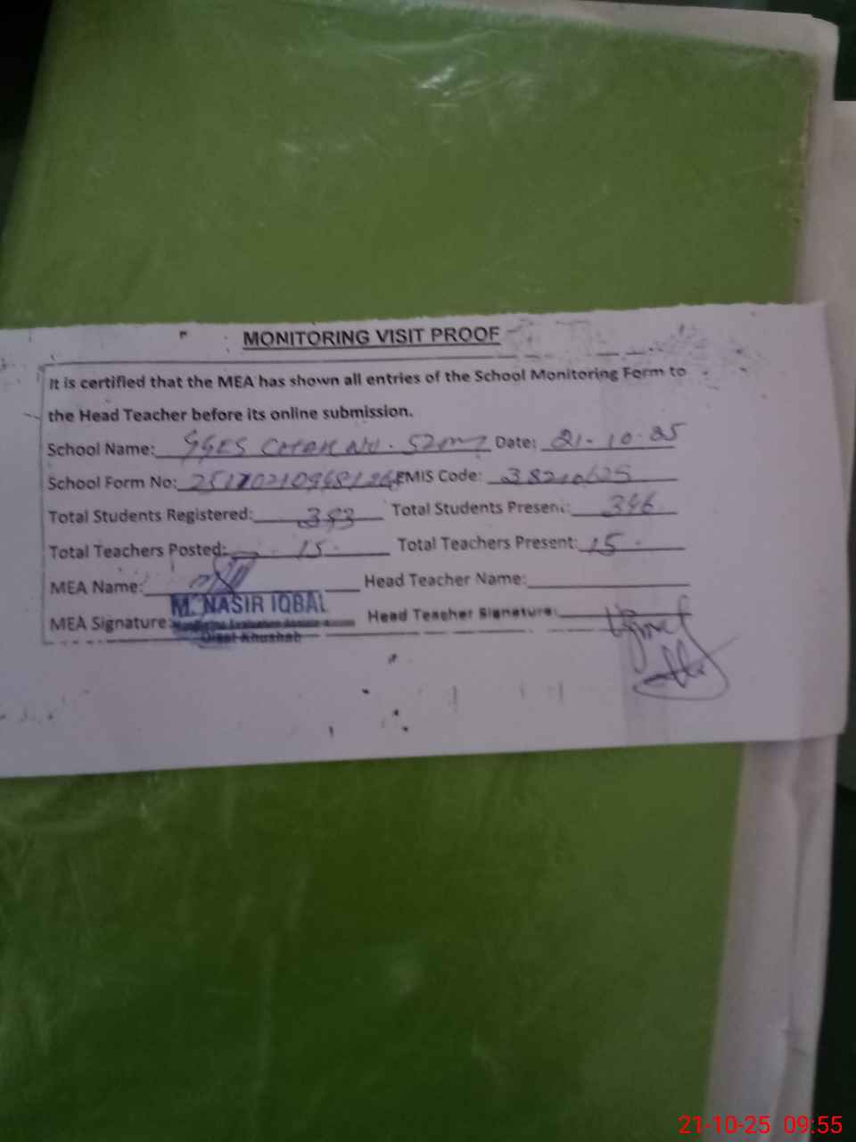 | Certified that this School was Inspected by the Undersigned MEA/DMO Today and the Information Stated Above is as Per Record. | |||||