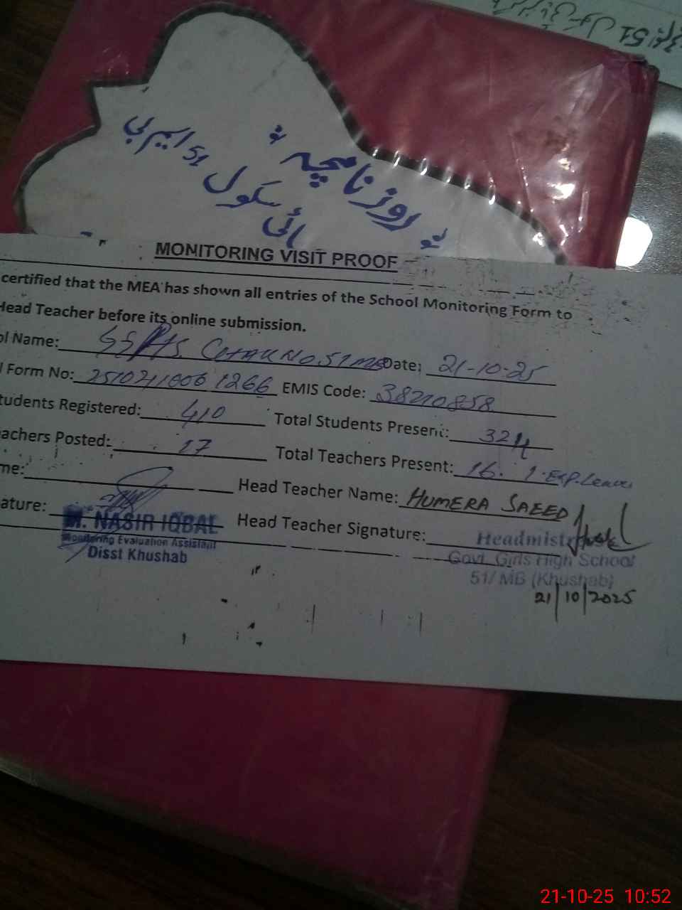 | EMIS Code: 38210858 | Name of School: GGHS CHAK NO 51 MB | |||