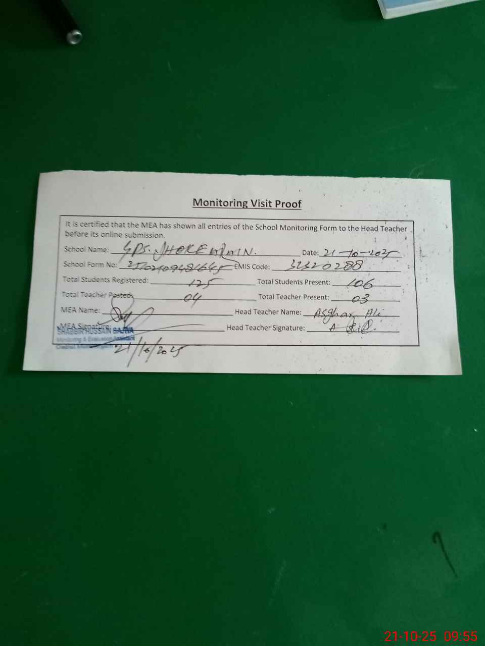 | Attendance Register | Head Teacher | MEA with School | Visit Proof |