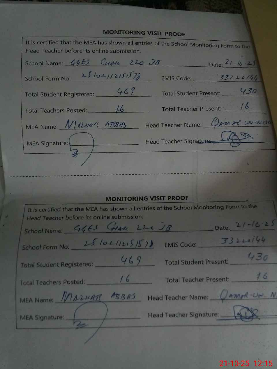 | EMIS Code: 33220144 | Name of School: GGES CHAK NO 220 JB | |||