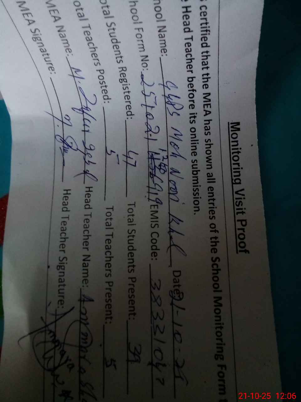 | Attendance Register | Head Teacher | MEA with School | Visit Proof |