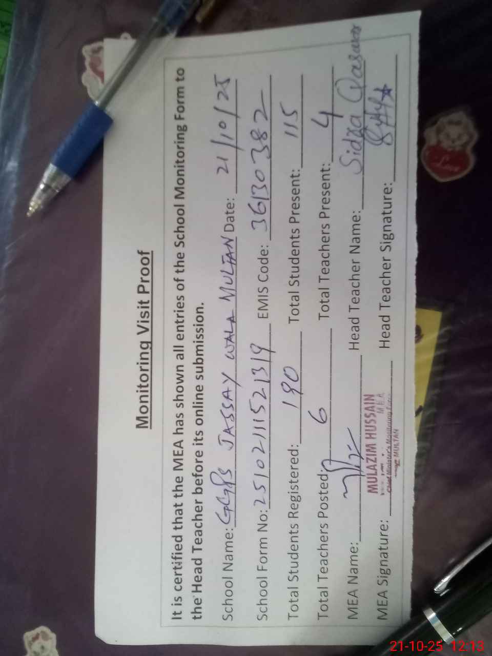 | Attendance Register | Head Teacher | MEA with School | Visit Proof |