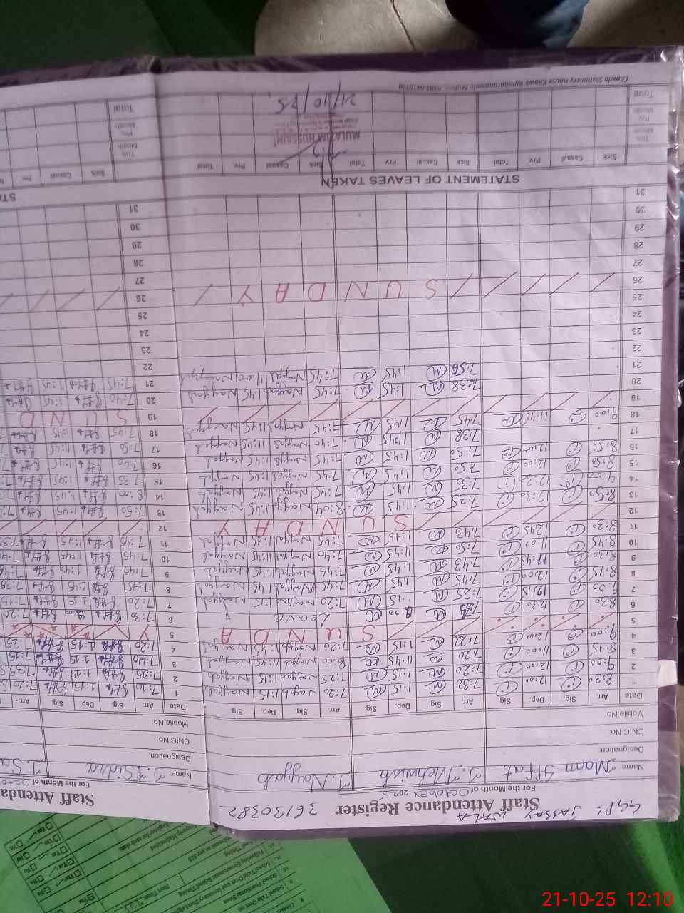 | 61**** | Mu**** Am**** Kh**** | PSSP | Temporary | 0 | 0 | 0 | 0 | 0 | 0 | 0 | 0 | 0 | Absent (Un-Authorized) |