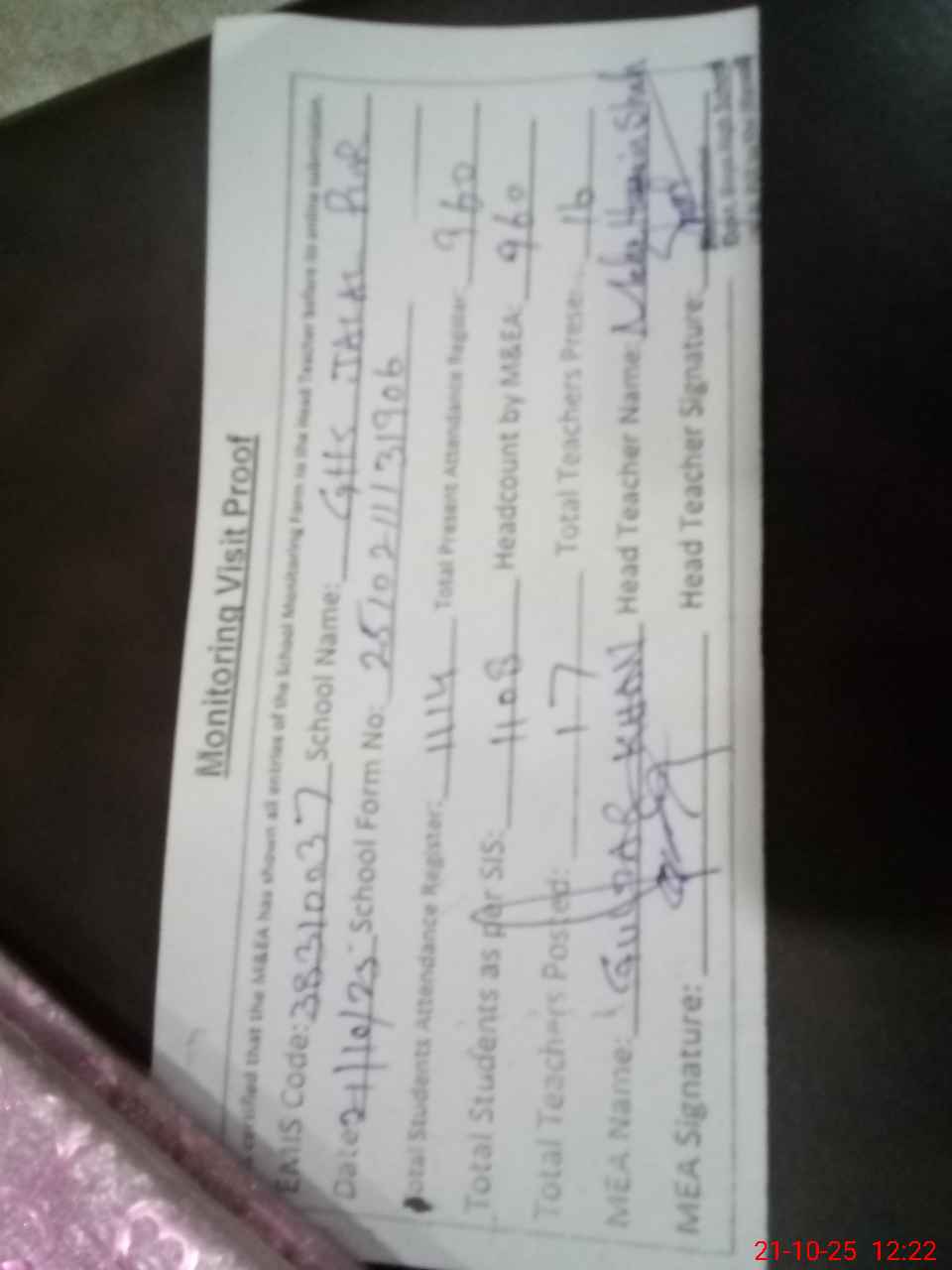 | Attendance Register | Head Teacher | MEA with School | Visit Proof |