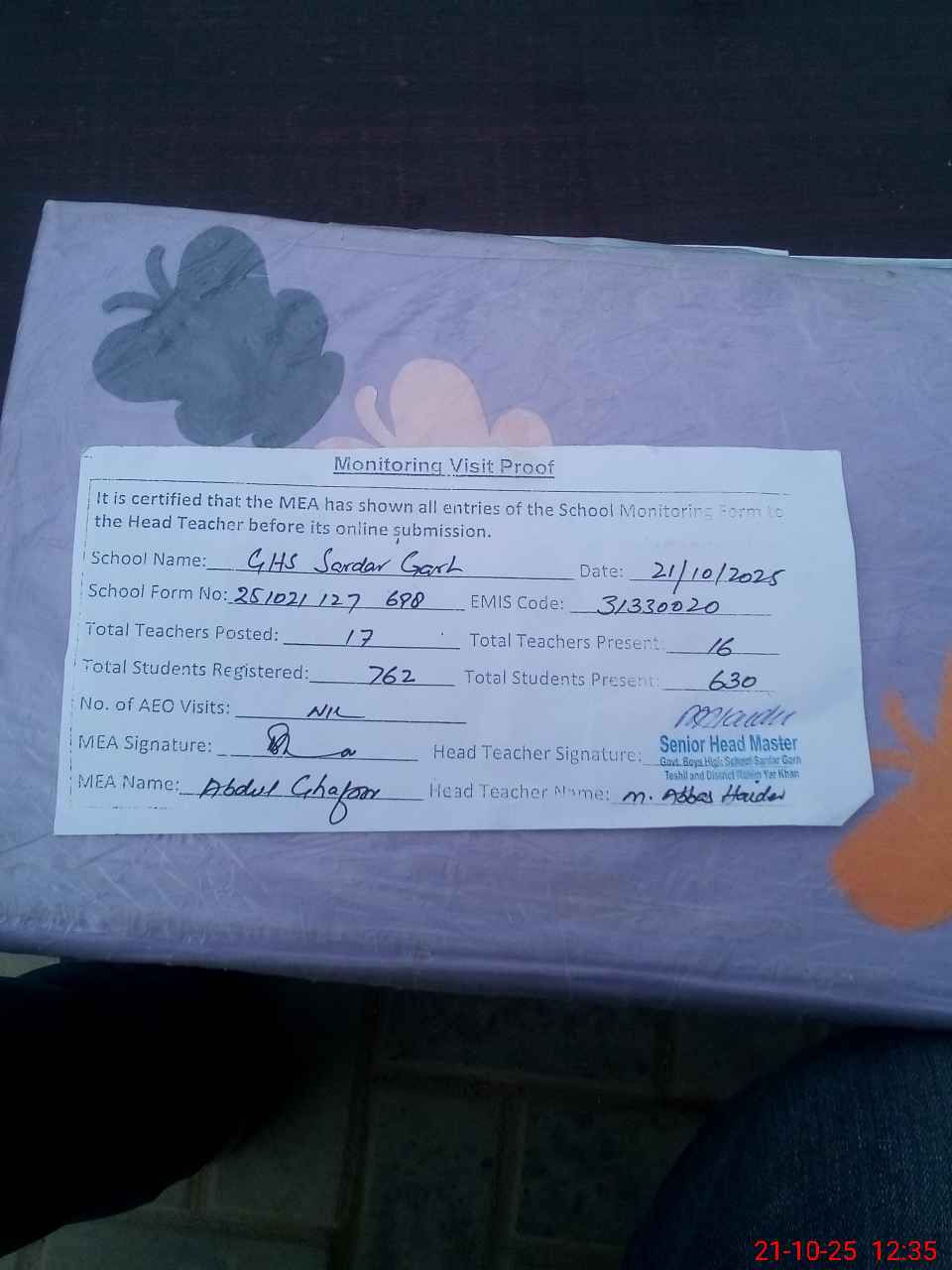 | Attendance Register | Head Teacher | MEA with School | Visit Proof |
