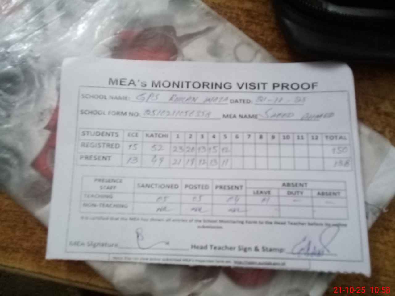 | Attendance Register | Head Teacher | MEA with School | Visit Proof |