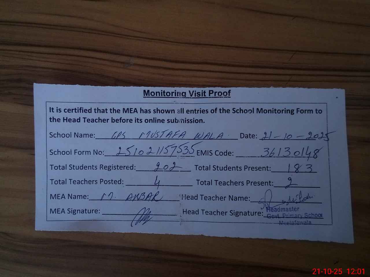 | Attendance Register | Head Teacher | MEA with School | Visit Proof |