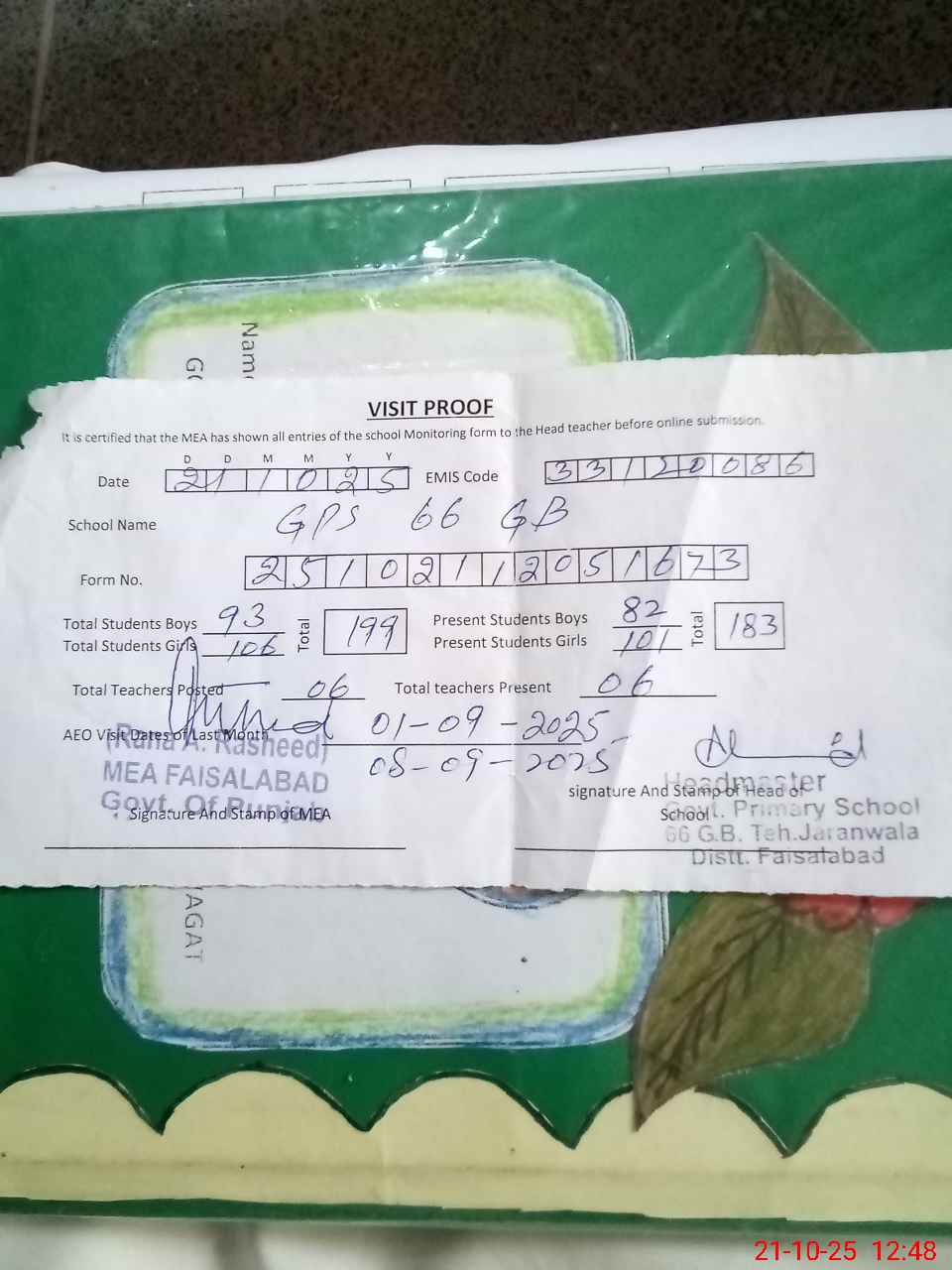 | Attendance Register | Head Teacher | MEA with School | Visit Proof |