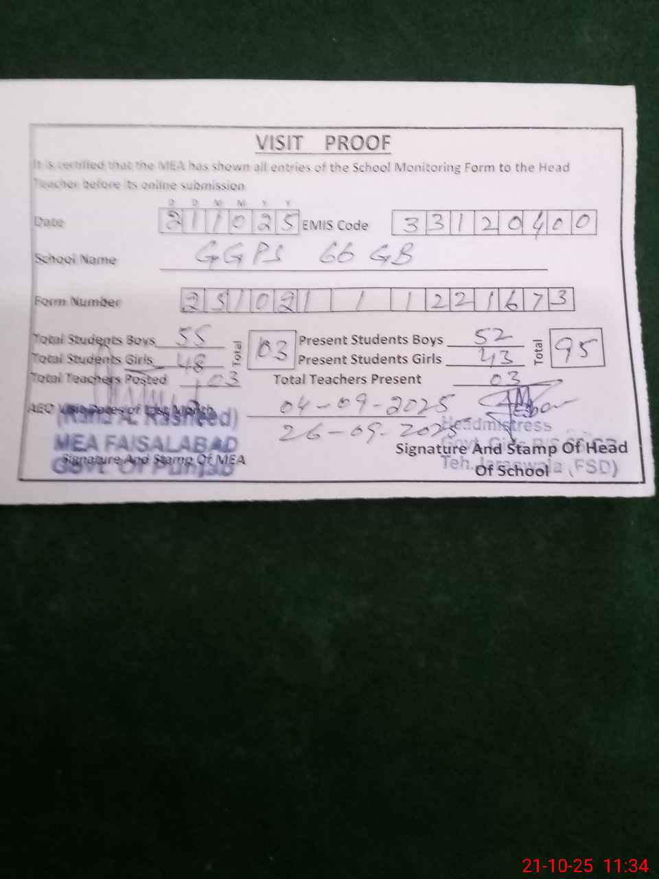 | Certified that this School was Inspected by the Undersigned MEA/DMO Today and the Information Stated Above is as Per Record. | |||||