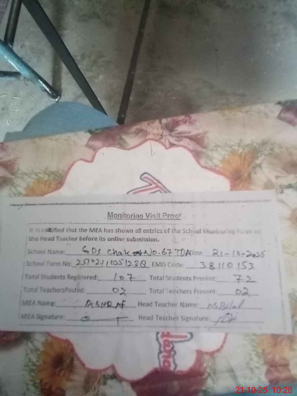 | EMIS Code: 38110153 | Name of School: GPS CHAK NO 67 TDA | |||