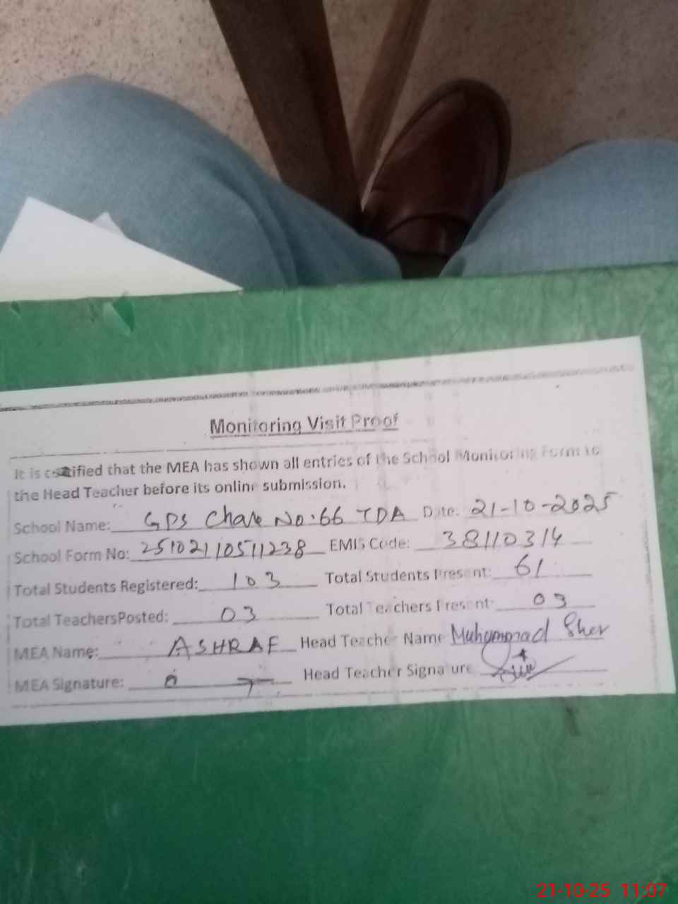 | EMIS Code: 38110314 | Name of School: GPS CHAK NO.66/TDA | |||