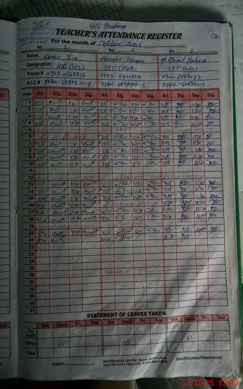 | CNIC | Full Name | Designation | R/C | Absence During Last Calender Month |