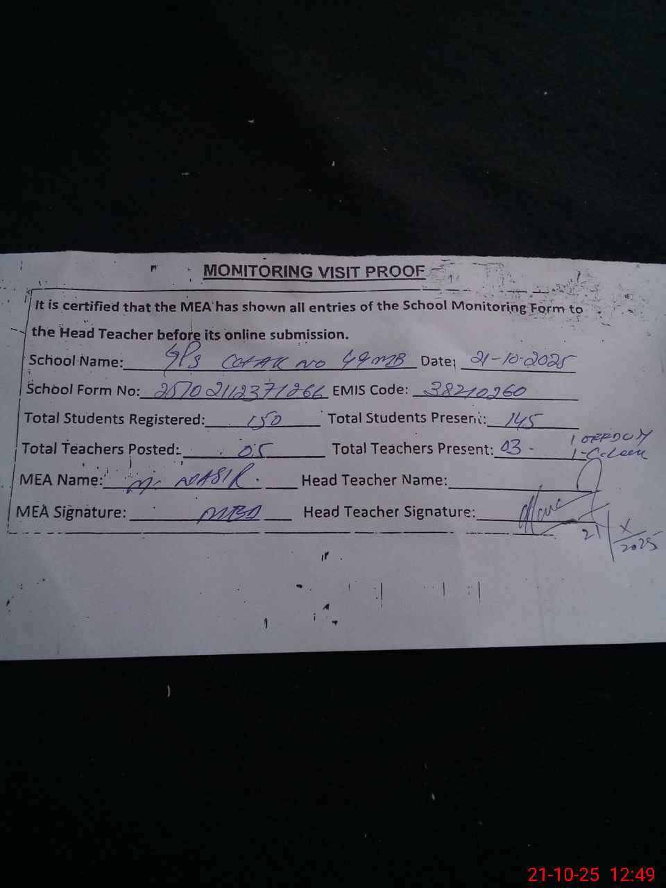 | EMIS Code: 38210260 | Name of School: GPS CHAK NO 49 MB | |||