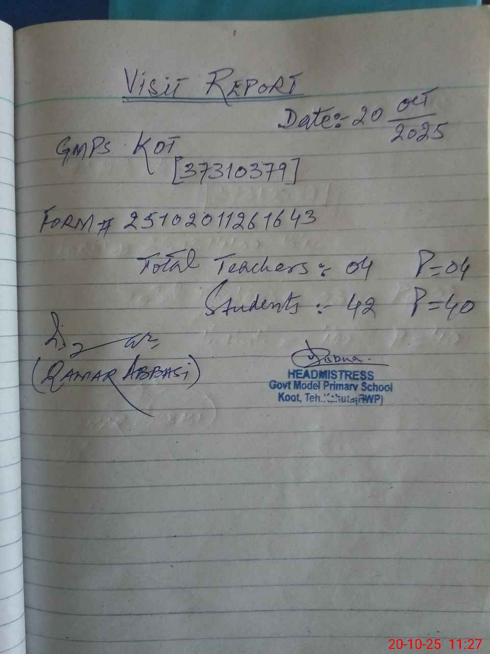 | Attendance Register | Head Teacher | MEA with School | Visit Proof |
