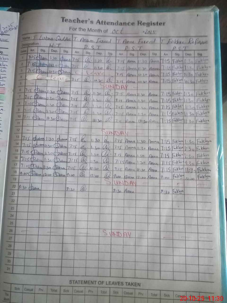 | Leave | Duty | Absent | Maternity | Medical | Ex- Pak |